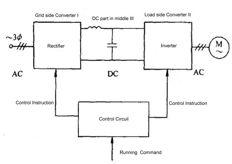 VFD وسیله ای است که منبع تغذیه فرکانس اساسی (۵۰ هرتز یا ۶۰ هرتز) را به منبع تغذیه متناوب فرکانس های مختلف تبدیل می کند تا بتوان موتور را با سرعت متغیر کنترل نمود. مدارات کنترلی  جهت کنترل مدار در نظر گرفته میشود و  مدار یکسو کننده جریان متناوب را به یک جریان مستقیم تبدیل می کند. مدار میانی DC خروجی مدار یکسوساز را صاف می کندو مدار اینورتر جریان مستقیم را به جریان متناوب تبدیل می کند. در مورد اینورترهای VECTOR CONTROLLED علاوه بر اینکه به محاسبات زیادی احتیاج دارد به CPU و برخی مدارهای مرتبط احتیاج داریم.
